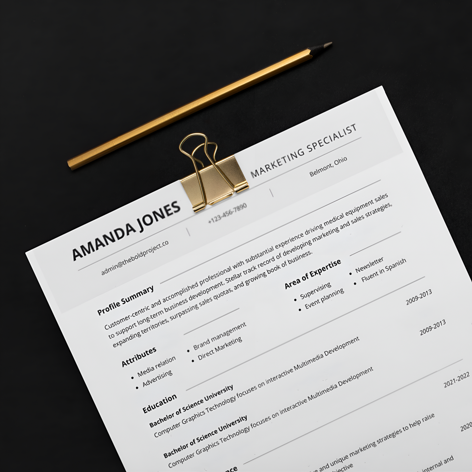 The Bold Project offers a sleek, professional resume template designed to help you stand out and secure that job interview. Our template features a clean, minimalist style that captures the attention of hiring managers, with easy-to-read text and compatibility with most modern fonts for easy editing. We ensure you make a strong first impression!